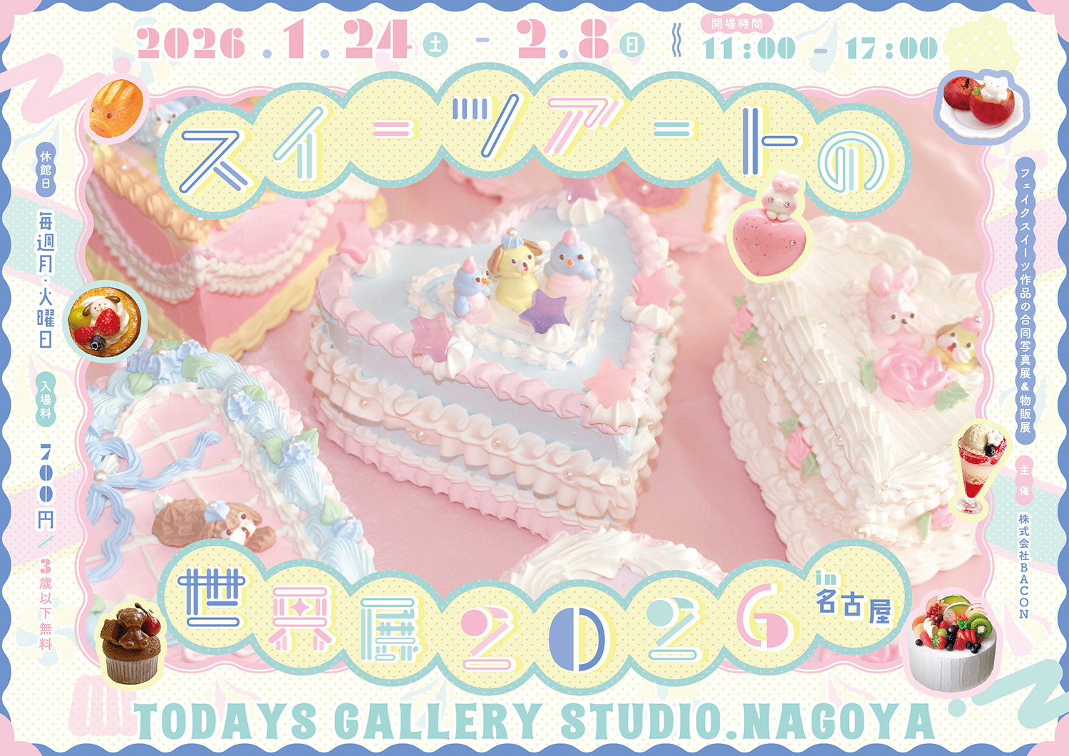 株式会社BACON(べーこん)は、可愛いフェイクスイーツの合同写真展&物販展「スイーツアートの世界展 2026 in 名古屋」を、TODAYS GALLERY STUDIO.NAGOYA(名古屋市中区)にて2026年1月24日(土)~2月8日(日)に開催します。精緻で可愛らしいフェイクスイーツ作品の数々が一堂に会し、新作展示や限定販売を通して、まるで物語の中に迷い込んだかのような“甘く夢のある世界”をお楽しみいただけます。