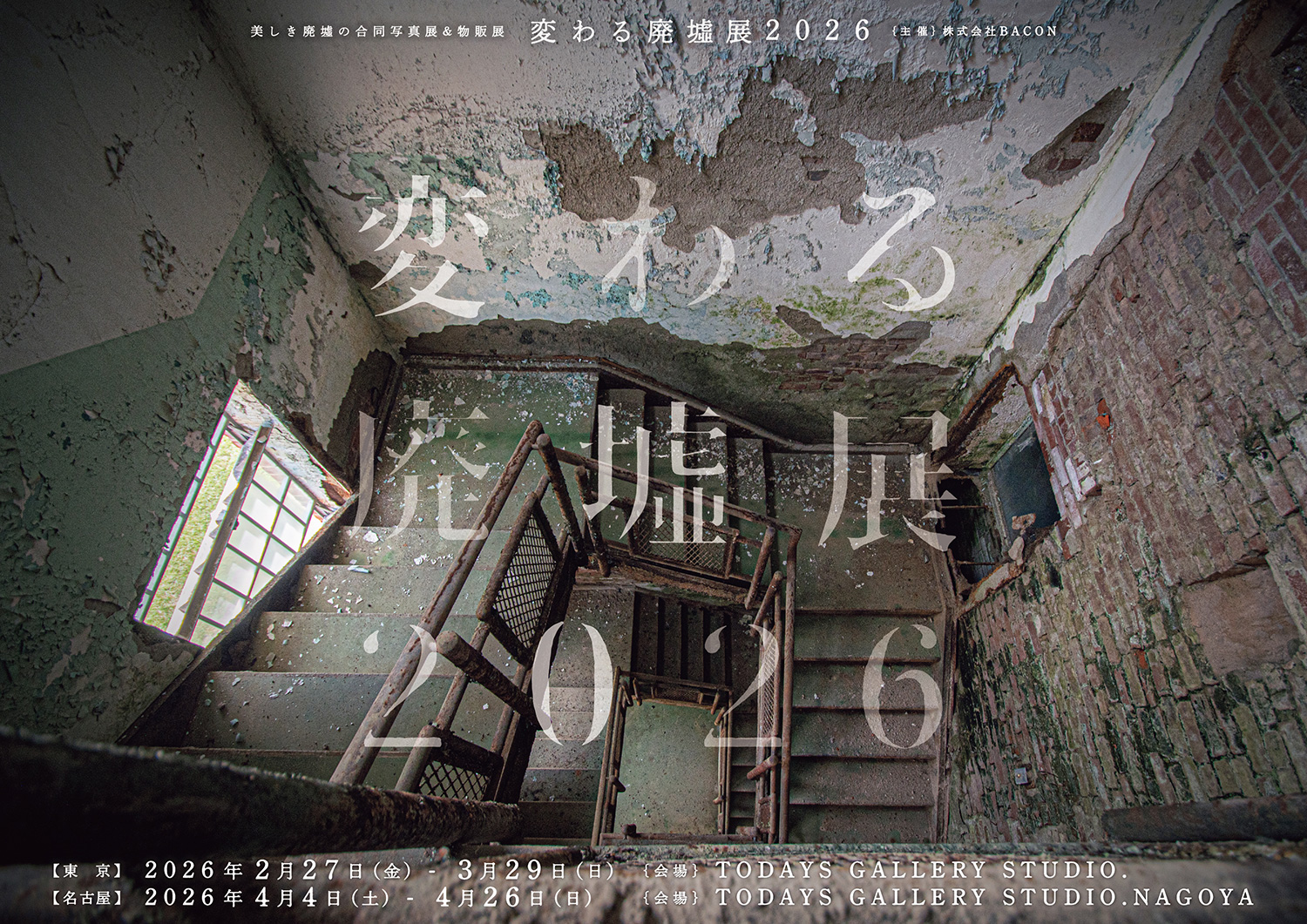 株式会社BACON(べーこん)は、従来のイメージを覆す美しさから、廃墟をアート作品へと昇華した写真展「変わる廃墟展2026」を、ギャラリー「TODAYS GALLERY STUDIO.」(東京・浅草橋)にて2026年2月27日(金)~3月29日(日)に開催いたします。4月4日(土)~4月26日(日)には、名古屋ギャラリーでの巡回展も決定しました。