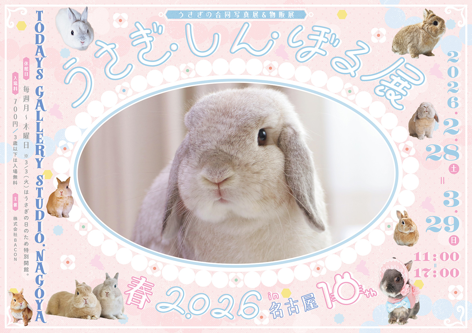株式会社BACON(べーこん)は、TODAYS GALLERY STUDIO. NAGOYA(名古屋市中区)にて、見ているだけで可愛いうさぎの写真やグッズを集めた合同写真展&物販展「うさぎしんぼる展 春 2026」を2026年2月28日(土)~3月29日(日)の期間で開催いたします。10周年を迎える本展は、過去最大規模の展示と豪華クリエイター陣が集結し、うさぎの魅力を五感で味わえる特別なシーズンとなります。作品鑑賞はもちろん、限定グッズやプレゼント企画など、訪れるたびに新しい発見が待っています。“うさぎ愛”あふれる会場で、心温まるひとときをお過ごしください。